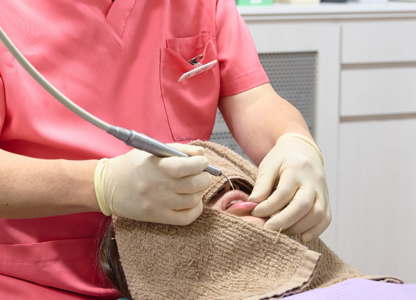レーザー照射によって組織ダメージや出血を軽減でき、縫合が不要なケースも多く術後の治癒が早いのが特徴です。 さらに、レーザー光には殺菌・消炎効果があるため、歯石除去後の歯周ポケット洗浄、口内炎治療、メラニン色素除去(ガムピーリング)など幅広い応用が可能です。